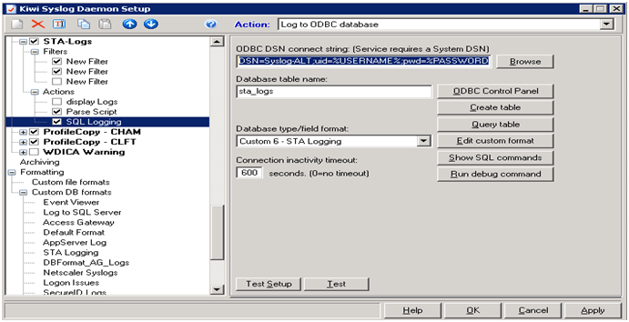 As you see below, you will need to set up an ODBC Connection for your Syslog Database and you will need to provide a connect string here (yes…in clear text so make sure you know who can log onto the syslog server). When you are all set click “Create Table” and click “Apply”