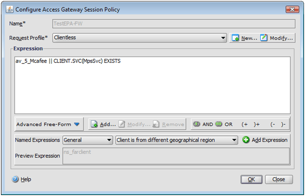 06-26-2010 12:16:05 Local7.Error 192.168.1.75 06/26/2010:11:41:06 GMT ns PPE-0 : SSLVPN CLISEC_EXP_EVAL 104254 : User wireless: – Client IP 192.168.1.50 – Vserver 192.168.1.100:443 – Client security expression CLIENT.SVC(MpsSvc) EXISTS evaluated to FALSE(3)