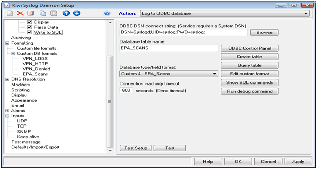 Make sure that your DNS Connect String is correct and make sure that you name the table EPA_SCANS under database table name and that you use the Custom DB Format EPA_Scans then click on “Create Table”