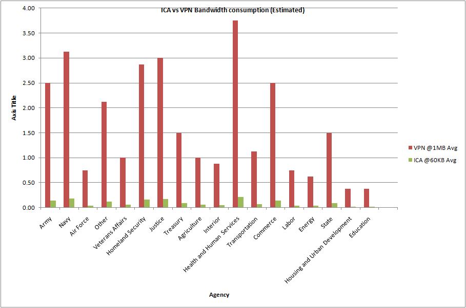Another big challenge to a large scale remote access solution is security. I think the current status quo is that most VPN users are IT Staff and a few other select users that the agency allows to have VPN Access. Even with today’s endpoint analysis, ensuring a computer is a Government Asset, has virus software and even encryption software is no guarantee that they will not have some sort of malware. Cyveillance.com states that AV Vendors detect, on average, less than 19% of malware attacks. 0-day malware will almost certainly go undetected on your government issued workstation if it gets on there and the VPN Tunnel becomes a definite INFOSEC concern. This is another good reason to use ICA as it differs in many ways from VPN outside of its lower bandwidth usage.