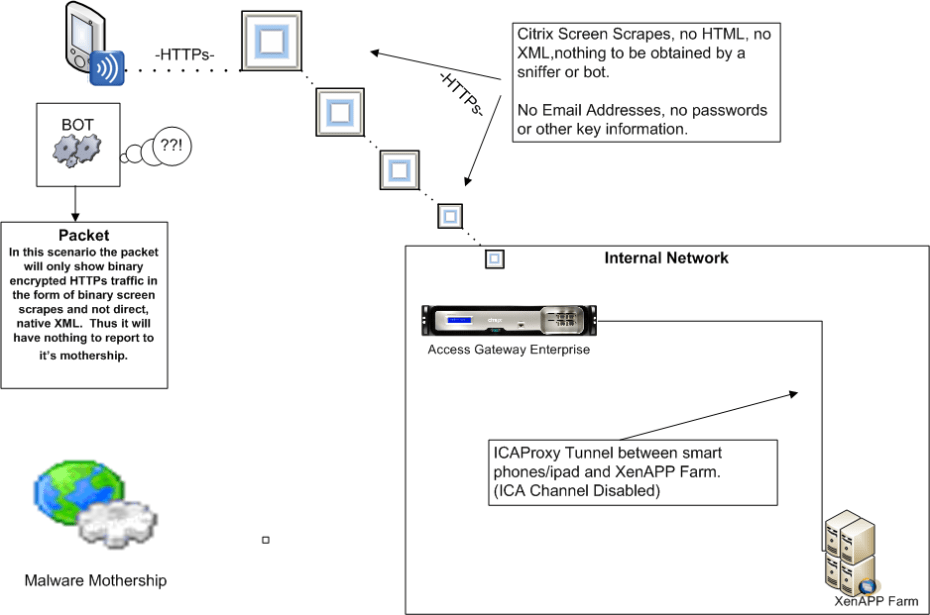 While I expect a lot of INFOSEC and IT Departments are going to say “No” when it comes to permitting the use of smart phones. I believe through thin computing via Citrix receiver and XenAPP or XenDesktop you can easily deliver safe and secure enterprise applications that will not run on the smart phone at all but rather on a locked down XenAPP Server or XenDesktop environment that only sends screen refreshes instead of full session traffic that can be sniffed or interpreted by a bot or malware.