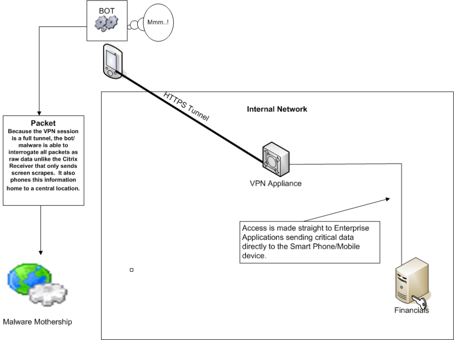 In this drawing we see how using the Citrix receiver is not a full VPN tunnel but an ICA Session that sends encrypted pixel refreshes to the end user instead of raw data. This means that if there is a zeus bot, or the like, on the phone looking for key html or xml such as “password” or “Card Number” it will not appear because the only data coming across is screen refreshes. This effectively keeps the data running on a restricted environment via XenAPP or XenDesktop.
