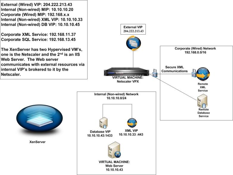So, let’s say you work in a heavily regulated environment where the datacenter-in-a-box solution is not an option. You can still hypervise your Netscaler and use it as a security wrapper and still allow the web server to consume SOAP based web services. The same way that I create a VIP on my external network and present it to internet based IP’s, I can create a VIP internally and present it to my hypervised web server that allows it to connect to and consume web services on my corporate network. If my web server on my closed system needs to consume XML services located on another host on the corporate intranet, I can create a VIP on the same VPX and present it to my internal network for consumption by internal virtual machines. Example: I have a VPX that is presenting an external VIP to end users on IP Address 204.222.213.43 that is portal to a web server on an internal (non-wired) XenServer network located at 10.10.10.43. This same web server consumes XML/SOA-based services on a host located on the corporate network at 192.168.11.37. In this scenario, I would create an internally facing VIP on 10.10.10.33 that presents these web services to my internal host using the VPX as the broker. Internet request for my web server are handled by the VPX and routed to 10.10.10.43 and internal SOA communications are handled by the VPX and routed from the internal network to 192.168.11.37. The Netscaler offers the ability to terminate any TCP based port on a VIP so I can present both web services and SQL listeners via an internal VIP to the protected web server. Thus my web server can make all of the necessary external calls while remaining inside the protective bubble provided by XenServer and the VPX.